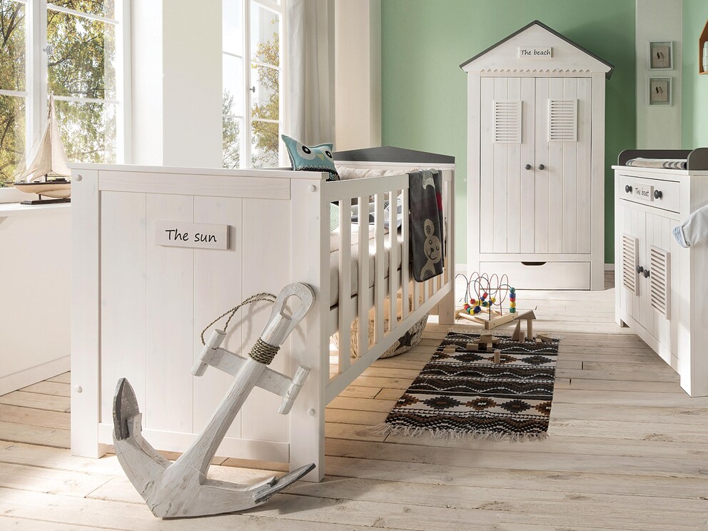 Het "Sunny" babybed geeft uw babykamer een maritieme flair. Het wit gelakte ledikant creëert een heldere, vriendelijke sfeer. Het dak op het hoofdeinde is in een mooie grijze kleur. Aan het voeteinde zit een klein etiket met de inscriptie "De zon". In tegenstelling tot andere ledikanten zijn de spijlen hier niet rond, maar in slatvorm, uiteraard met zorgvuldig afgezwakte randen.