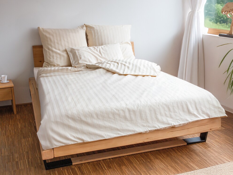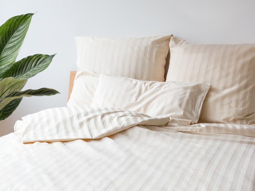 Dit prachtige bedlinnen van subtiel glanzend katoensatijn overtuigt met een elegant, ingeweven streepmotief. Juist in deze mooie, zuivere crèmetint ziet "Kastilla" er bijzonder stijlvol uit.