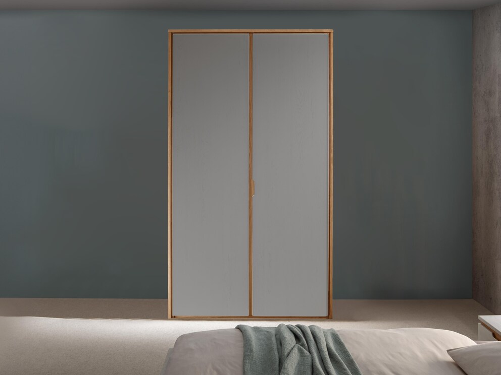 De draaideurkast "Gravia" overtuigt door zijn strakke lijnen, hoogwaardige materialen en zijn opvallende look. De kastromp van natuurlijk wildeiken brengt warmte en structuur in de slaapkamer, terwijl de gladde deurpanelen in grijs of wit een modern, rustig contrast vormen.