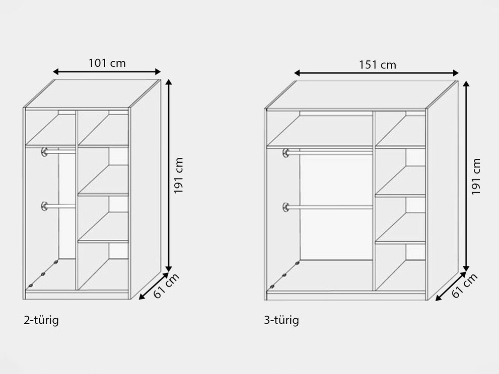 In de 2-deurs versie vinden de jassen van uw kroost de perfecte plaats achter één deur op 2 korte kledingstangen boven elkaar. De tweede deur verbergt 3 praktische legplanken. Bij het 3-deurselement is de kant van de kast met de kledingstangen dubbel zo breed. Let ook op de beschrijving van de binnenverdeling op deze productpagina.