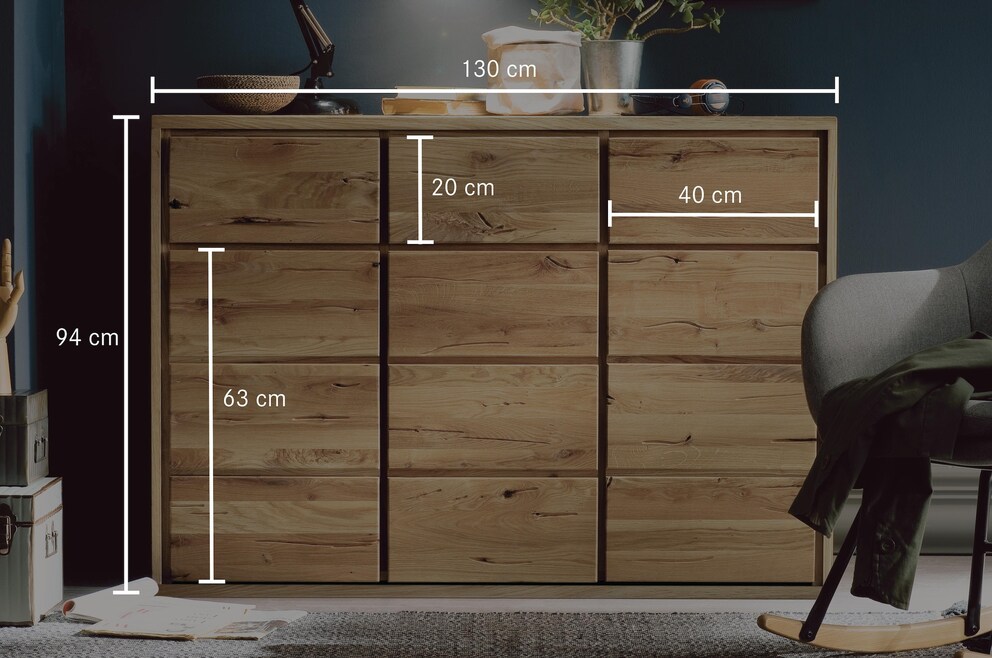 Dit edele dressoir inspireert met zijn adembenemende eenvoud. "Minder is meer" - het ontwerp is strikt geometrisch gerasterd. Geen handgrepen of andere overbodige versieringen leiden de aandacht af van de fascinerende houtstructuur van het rustieke wildeiken.