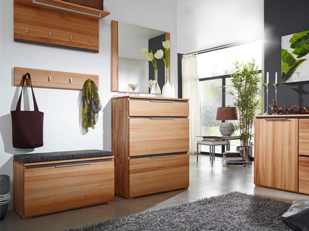 De grote, rechtlijnige klep laat de levendige nerf van het kernbeuken vakkundig zien. Een smalle metalen hoekgreep accentueert de antracietkleurige dwarsbalk aan de bovenrand. De stangenverlijmde voorkant met doorlopende latten onderstreept de waarde van deze mooie bank "Made in Germany".