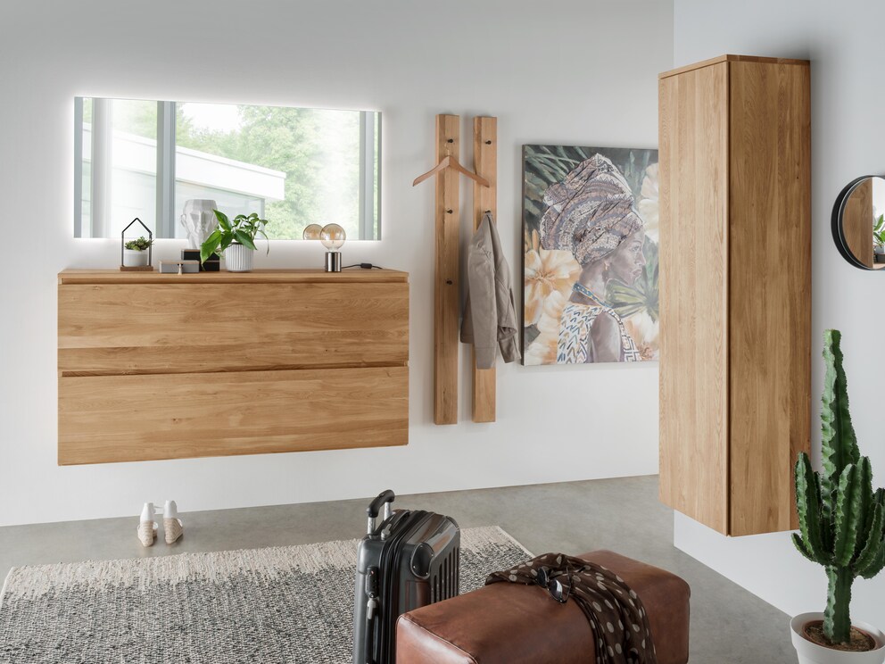 Het halmeubelprogramma "Volitare" biedt u en uw gasten een eersteklas ontvangst. Deze moderne serie inspireert door zijn visuele lichtheid, aangezien alle meubelen zijn opgehangen. Het massief wilde eiken wordt aantrekkelijk geaccentueerd door het rechtlijnige en greeploze ontwerp.