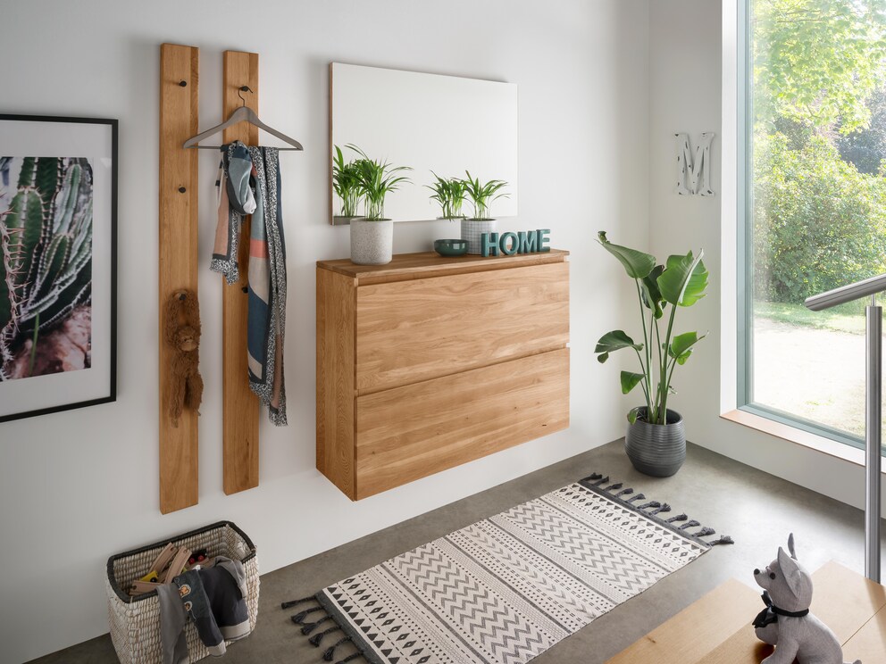 De trendy haakoplossing ziet eruit als drie oversized metalen spijkers. Het matzwart vormt een perfect contrast met het edele wild eikenhout. En met meerdere kastpanelen kunt u uw individueel kastlandschap samenstellen, afhankelijk van de ruimte die u nodig hebt.