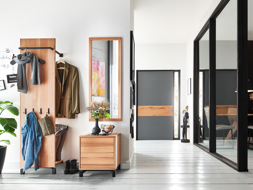 ... dat het beste bij u en uw hal past. Bespaar uzelf het planningswerk en profiteer van het aantrekkelijke prijsvoordeel ten opzichte van de aanschaf van de losse meubels. Het moderne halprogramma fascineert met zijn geslaagde materiaalcombinatie van massief hout en zwarte metalen elementen.