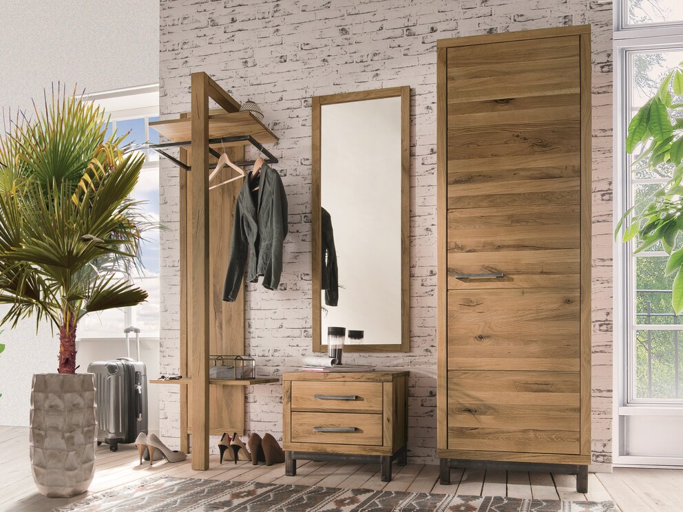 De deur, ontworpen met subtiele dwarsvoegen, is vlak in de romp verwerkt. De rechtlijnige halkast in moderne industriële stijl staat op een voetstuk van gezwart metaal. De beugelgrepen zijn hierop afgestemd.