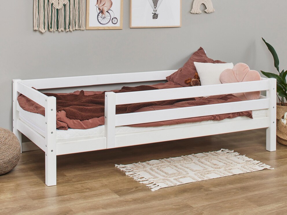 De eerste variant biedt een eenvoudig hoofd- en voeteneinde, dat zich dankzij de strakke lijnen harmonieus in elke kinderkamer laat integreren. Wanneer het bed vrij in de ruimte staat, is instappen aan beide zijden mogelijk. De tweede variant fungeert als een slimme kajuitbed, dat overdag met een paar kussens in een handomdraai verandert in een gezellige bank. De derde variant biedt voor kleinere kinderen of kinderen die onrustig slapen de perfecte oplossing. Met een rondom vallende uitvalbeveiliging en een comfortabele opening aan de voorkant zorgt het kinderbed voor extra veiligheid. Zelfs kleine kinderen kunnen zich hier veilig en geborgen voelen. En als uw kind de extra bescherming niet meer nodig heeft, kunt u deze eenvoudig verwijderen.