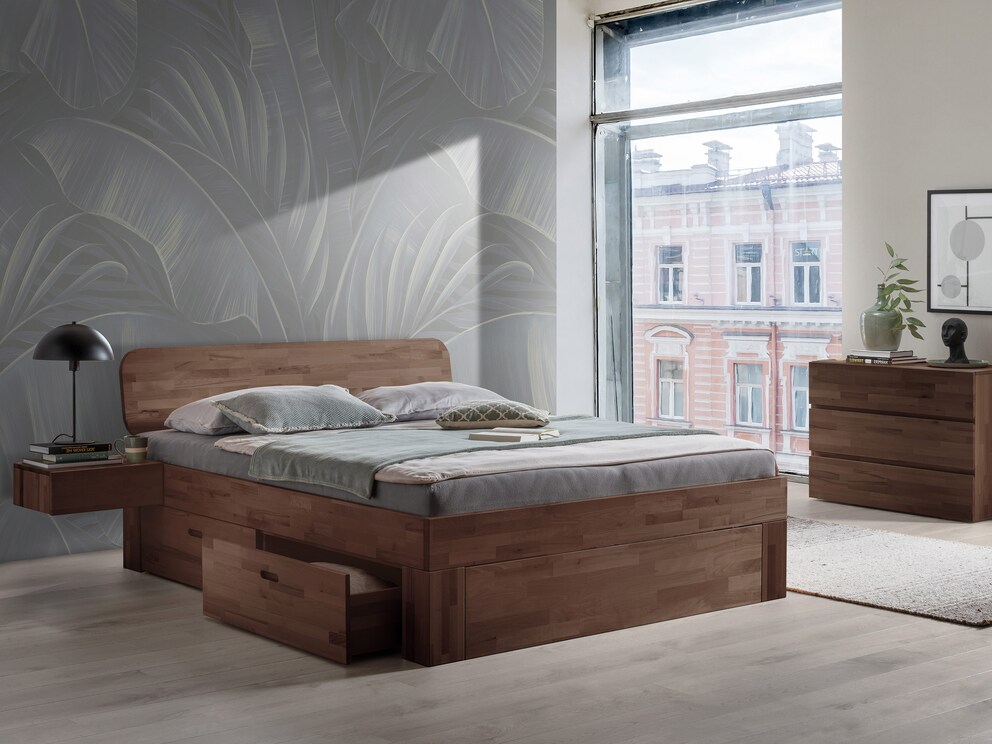 Om ervoor te zorgen dat het ladebed optimaal bij u past, kunt u kiezen uit twee elegante houten hoofdborden. Ook wat betreft de houtsoorten kunt u uw favoriet kiezen. Het massieve kernbeuken overtuigt met zijn natuurlijke, levendige nerf, terwijl wildeiken indruk maakt met zijn opvallende, tijdloze uitstraling. Met het beukenhout in donkere mokka-kleur creëert u prachtige kleuraccenten, terwijl het bed in witgelakt beuken een lichte en moderne uitstraling heeft. Het ladebed "Lunara" combineert een tijdloos design met praktische opbergruimte en past moeiteloos in elke slaapkamer.