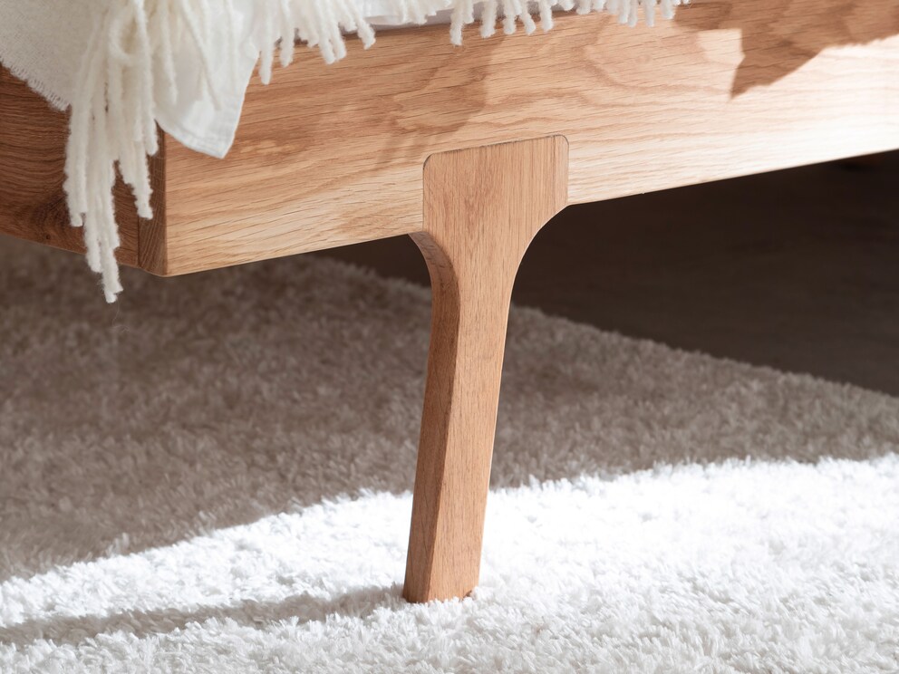 Het keizerlijke ontwerp van het tweepersoonsbed wordt verder benadrukt door het kostbare wilde eikenhout. De licht gebogen poten zijn vakkundig verwerkt in de zijpanelen en geven het bed een zekere lichtheid, omdat ze niet direct aan het uiteinde van het bed staan. Het hoogtepunt van het bed is het hoofdeinde. Het houten frame met de elegant gebogen zijkanten is vakkundig vervaardigd en creëert een unieke look in combinatie met het Weense vlechtwerk. "Belvedere" combineert Weens vlechtwerk met een moderne designtaal en herinterpreteert zo dit klassieke meubelstuk op een geheel nieuwe manier.