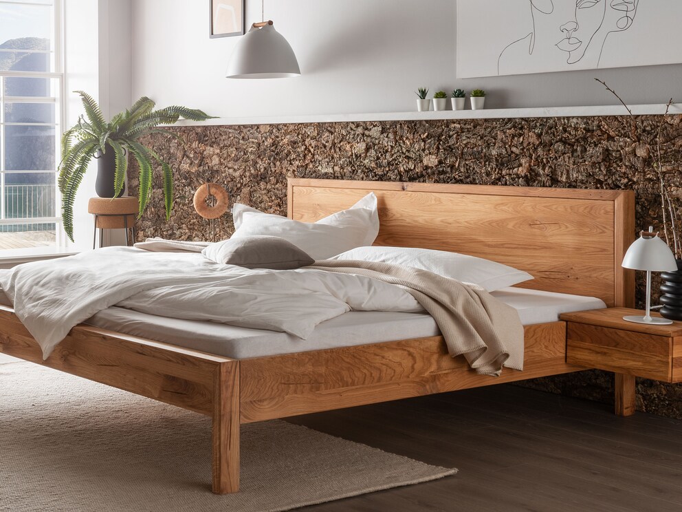 Het massief houten bed "Capania" maakt indruk met zijn heldere vorm en minimalistische ontwerp. De natuurlijke nerf van het massief wild eikenhout wordt prachtig geaccentueerd op het brede frame. Het hoofdbord van geborsteld massief hout, dat effectief wordt omlijst door het smallere houten frame, voegt een extra vleugje natuurlijkheid toe. Het gestoffeerde hoofdbord van grijs vilt is een comfortabel alternatief. Het geeft het bed een karaktervolle look die perfect past in een moderne slaapkamer.