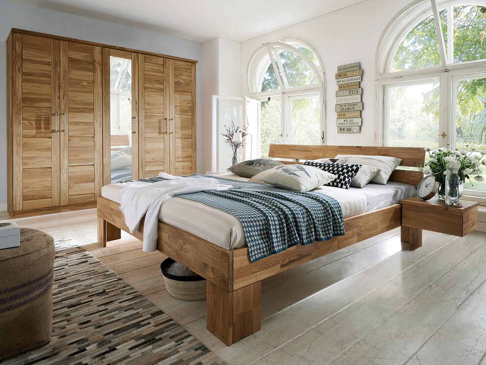 Het tweedelige, licht schuine hoofdbord vormt een indrukwekkend contrast met de verder vrij sterke vorm van het bedframe. Bovendien benadrukken de gemarkeerde schuine poten het rustieke karakter.