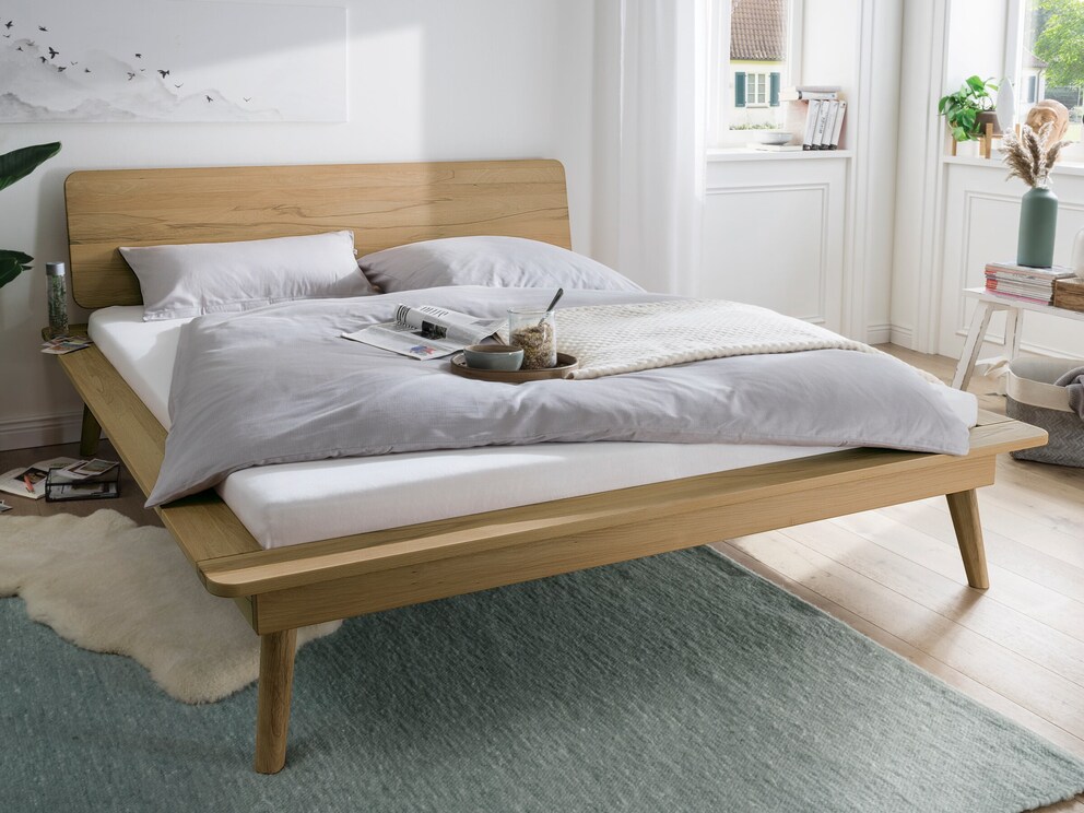 De brede rand toont trots de nerven van het edele massieve hout, de geringe dikte geeft "Zanira" toch een filigraan uiterlijk. De slanke en conisch taps toelopende bedpoten in een hoek zorgen voor een fascinerende visuele lichtheid.