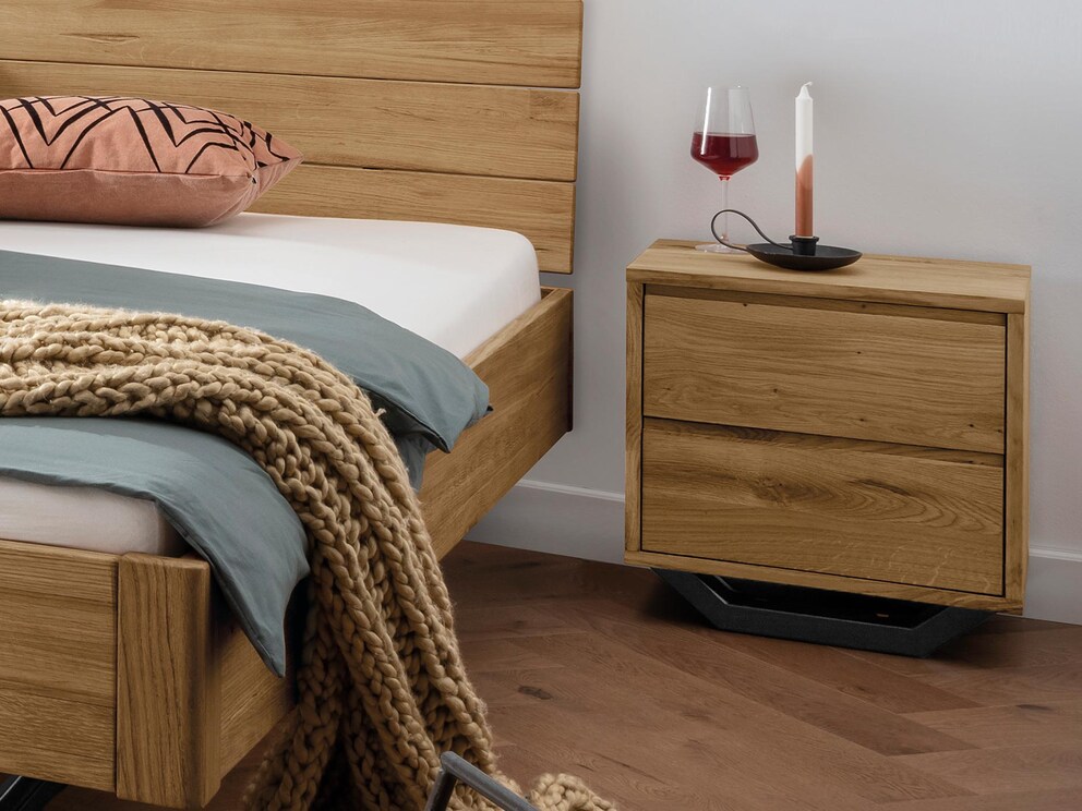 De lades gaan gemakkelijk open aan de discrete, gefreesde handgrepen. De metalen loper geeft het nachtkastje zijn moderne look, passend bij je "Novito" zwevend bed.