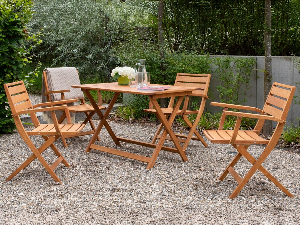 De klapstoel "Estiva" doet met zijn gebogen armleuningen en halfhoge rugleuning denken aan een klassieke regisseursstoel. Dankzij de praktische klapfunctie is de stoel in een handomdraai klaar voor onverwachte gasten en kan hij ook weer snel worden opgeborgen om ruimte te besparen.