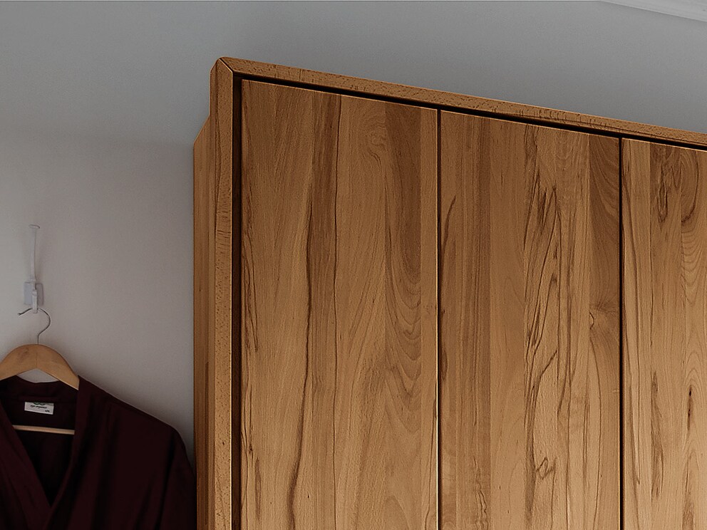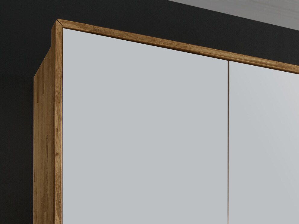 Geef uw draaideurkast een elegante omlijsting: onze hoogwaardige passepartout-omlijstingen zijn naar keuze vervaardigd uit massief kernbeukenhout of massief wildeikenhout. De zorgvuldig in verstek verwerkte hoekverbindingen zorgen voor een harmonische uitstraling, blijvende stabiliteit en geven uw kledingkast een elegante en hoogwaardige uitstraling.