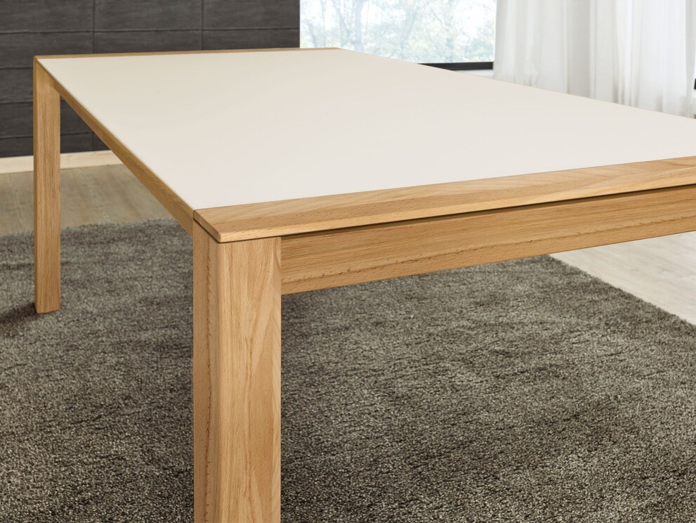 Heeft u graag gasten? Dan moet u kiezen voor de tafel met uitschuifsysteem. Ongeacht welk tafelblad u heeft gekozen - de klap-inlegstukken van het frame-uitreksysteem zijn altijd uitgevoerd in de houtsoort van de tafel. Afhankelijk van de gekozen tafellengte is een verlenging tot 100 cm mogelijk - plaats voor 4 personen extra!