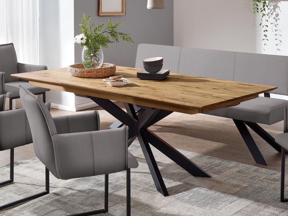 ...voor lieve bezoekers. Het houten frame in trendy spidervorm is niet alleen een bijzondere blikvanger, maar zorgt ook voor enorme beenruimte. Mag het voor u iets spectaculairder zijn? Dan kunt u kiezen voor het trendy, zwart gepoedercoate frame of de extravagante uitvoering van geborsteld roestvrij staal. Met de optionele hoogwaardige uitschuifbare rand creëert u in een handomdraai ruimte voor extra gasten. Kies afhankelijk van de ruimte en uw behoeften de gewenste maat met een uitschuifbare rand aan één of beide zijden.