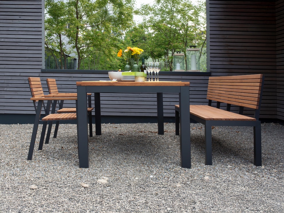 "Verano" is de perfecte tuintafel voor gezellige zomeravonden in de open lucht, want het grote tafelblad biedt voldoende ruimte voor drankjes en allerlei soorten eten. Deze unieke tafel overtuigt vooral door het extravagante ontwerp van het tafelblad. Hier zijn smalle lamellen dicht op elkaar geplaatst en op een verfijnde manier zonder rand ontworpen.