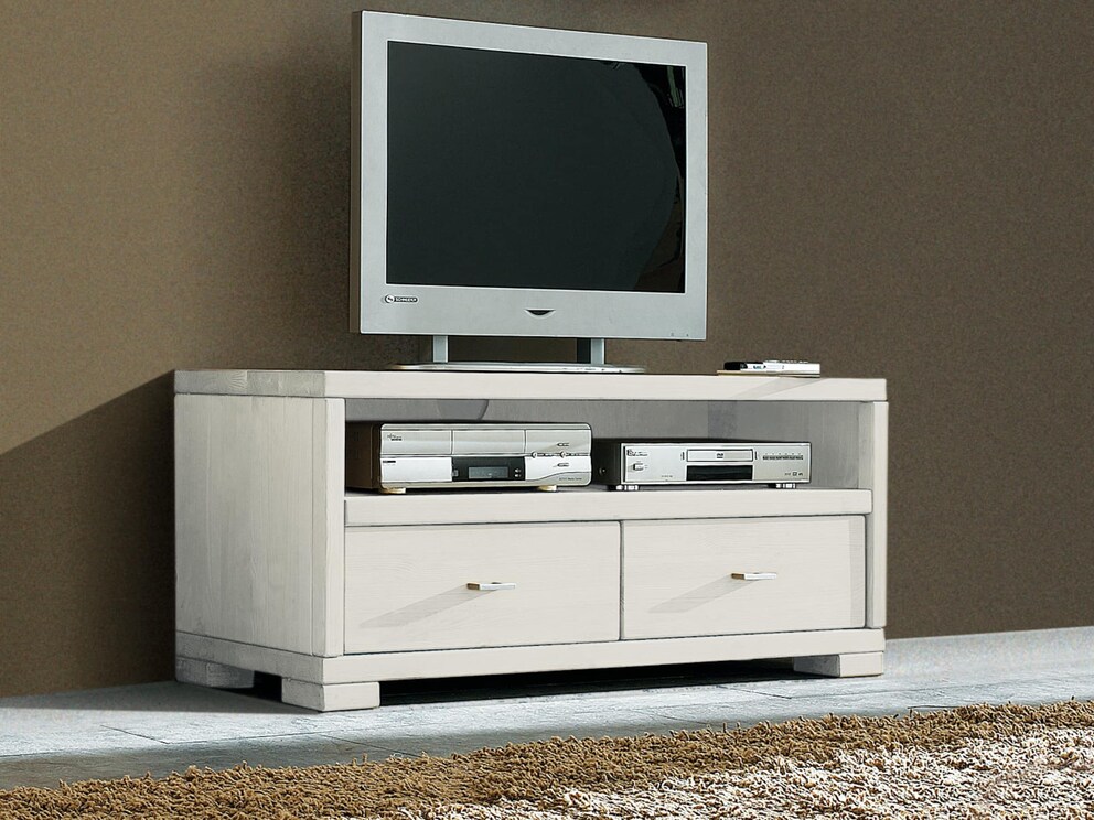 Het achterpaneel heeft al een praktische kabeluitgang. Bovendien kunt u accessoires zoals afstandsbedieningen, koptelefoons, dvd's en dergelijke opbergen in de 2 ruime lades met volledig uittrekbaar. De laden van het lowboard "Mascella" kunnen worden geopend met mooi gevormde metalen handgrepen, die een koel, metaalachtig accent leggen op het warme, met loog/olie geoliede oppervlak. De stijlvolle handgrepen zijn niet minder aantrekkelijk op het wit gelakte grenenhout.